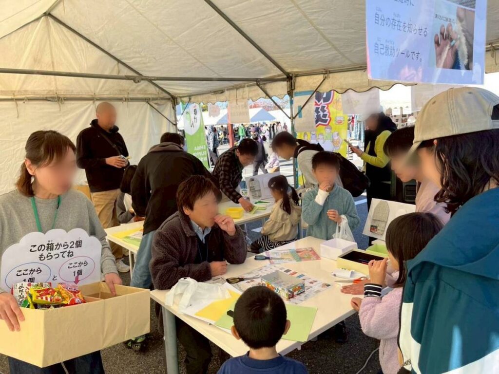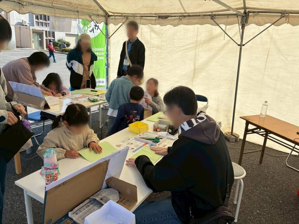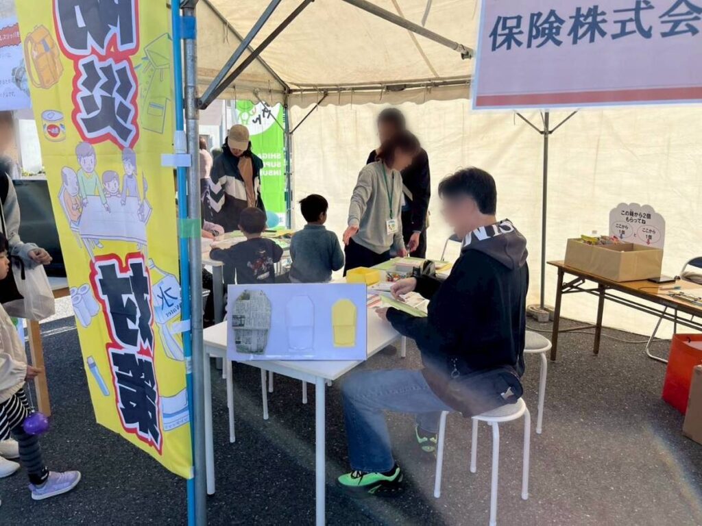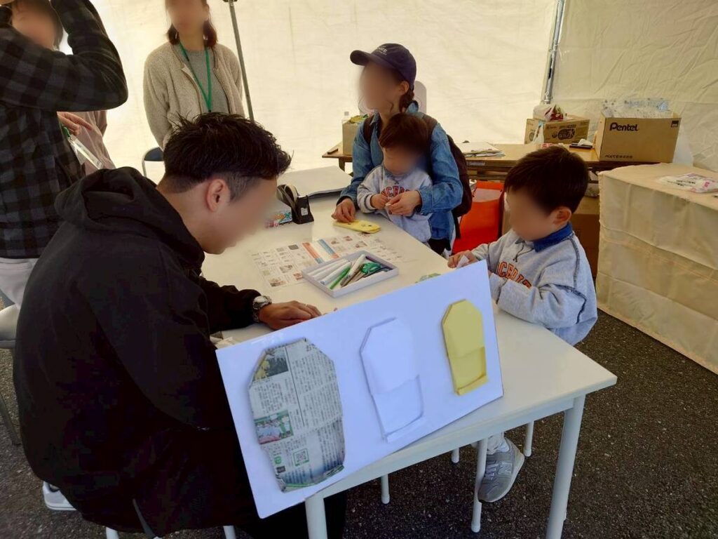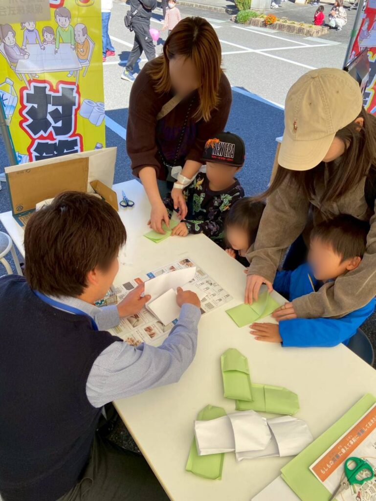 11月16日、地域の皆さまとともに「蒲生いきいきあかねフェア」に出店し、防災をテーマにしたワークショップを開催しました。今回は、新聞紙でつくる『スリッパ』と、ストローとハサミでつくる『ホイッスル』の2つの工作体験をご用意。子どもからご年配の方まで、幅広い世代の方々が参加してくださいました。
