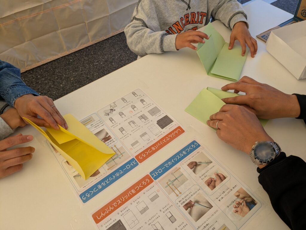 スリッパづくりでは、新聞紙で折るだけでなく、画用紙に自由にイラストを描いたりシールを貼ったりして、世界にひとつだけのオリジナルスリッパを完成させました。子どもたちは真剣な表情で取り組み、完成したスリッパを嬉しそうに持ち帰ってくれました。私の4歳の息子も参加し、帰宅後に自分で10足ほどスリッパを作り、それぞれに名前や特徴をつけて説明してくれる姿に、ものづくりの楽しさがしっかり伝わったことを実感しました。