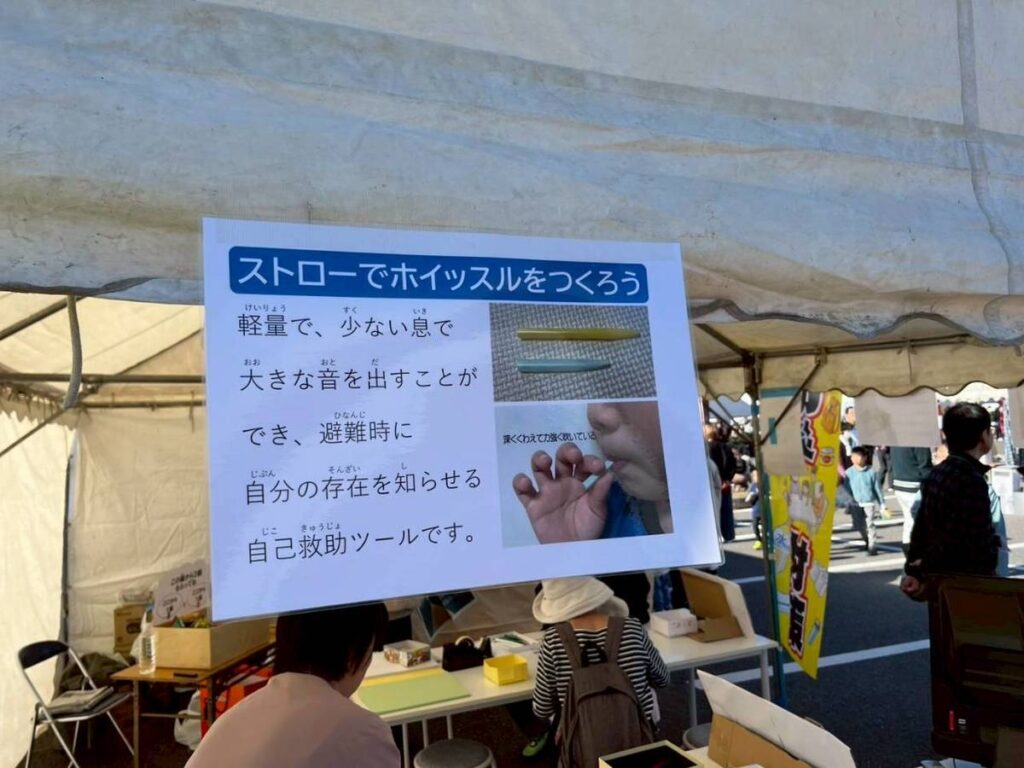 今回のワークショップは、楽しい工作体験であると同時に、防災の知恵を伝える場でもありました。災害時、避難所ではスリッパのような履き物が不足しがちです。床の冷たさや破片から足を守るためにも、新聞紙で簡単に作れるスリッパは、非常時に役立つ知恵のひとつです。また、ホイッスルは、瓦礫の下敷きになったときや助けを呼びたいときに、自分の居場所を知らせる命綱となることがあります。ストローとハサミさえあれば作れるこのホイッスルは、子どもでも簡単に扱える防災アイテムとして、ぜひ多くの方に知っていただきたいと思っています。